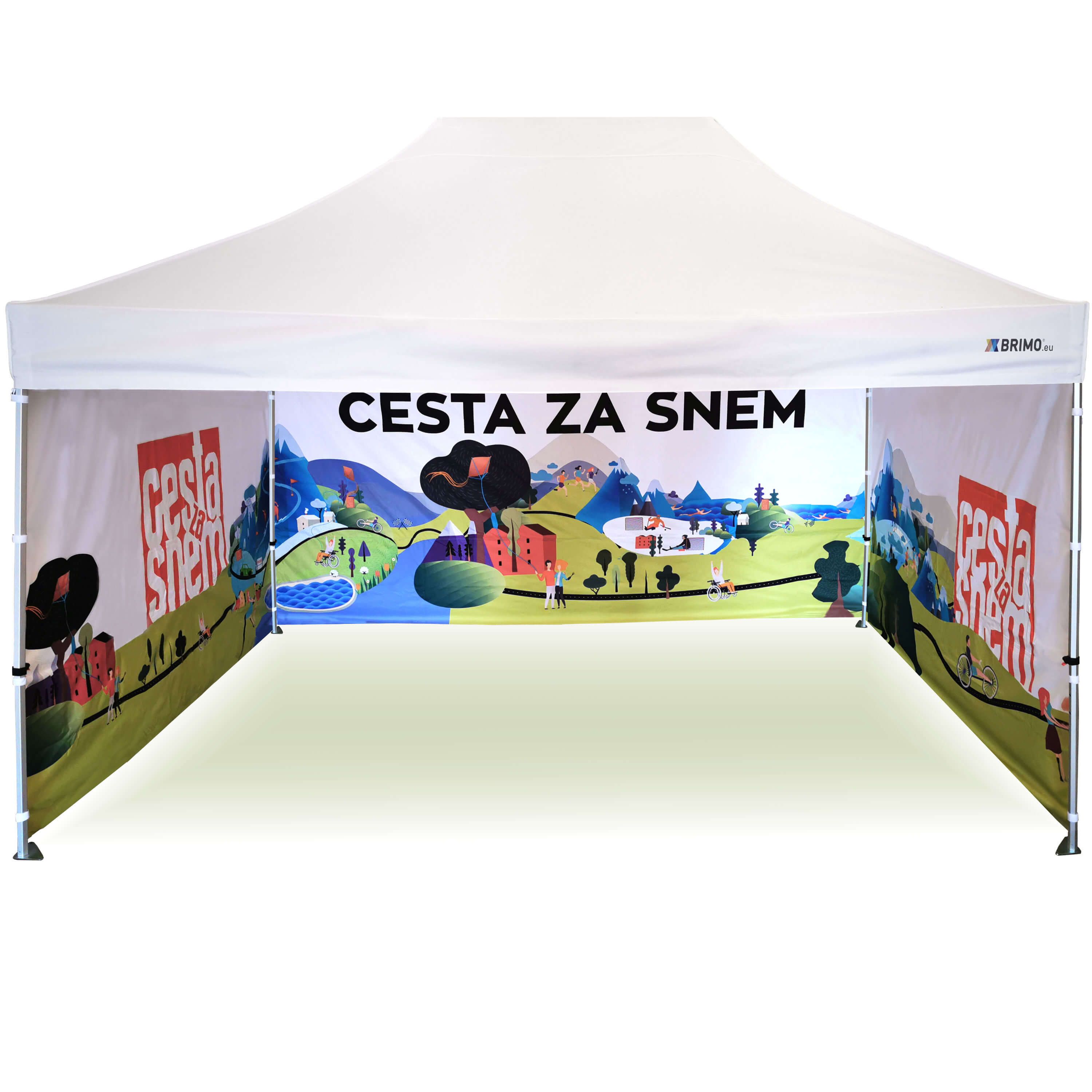 Corturi publicitare cu imprimare digitală prin sublimare. Imprimarea apare printr-un proces chimic în care cerneala, sub influența temperaturii ridicate, pătrunde direct în structura materialului. Logo, text sau orice tip de grafică pe partea interioară sau exterioară a cortului, conform dorințelor clientului.