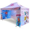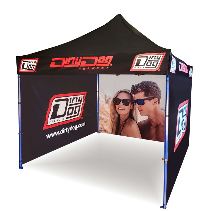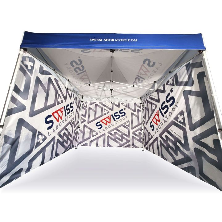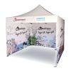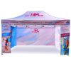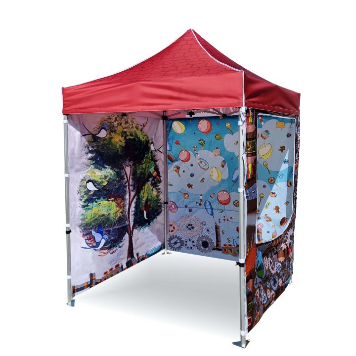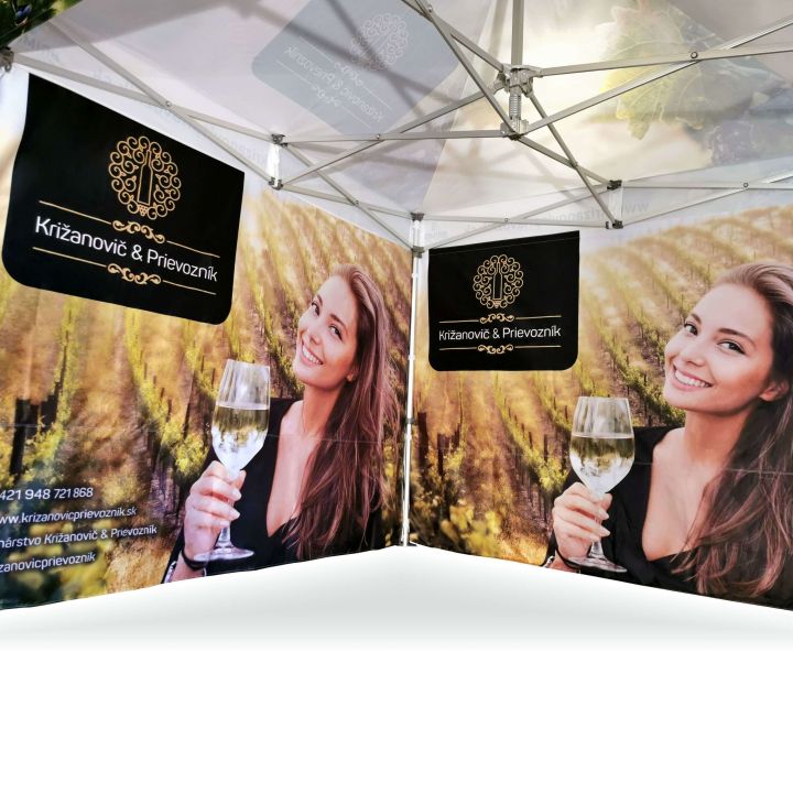 Corturi publicitare cu imprimare digitală prin sublimare. Imprimarea apare printr-un proces chimic în care cerneala, sub influența temperaturii ridicate, pătrunde direct în structura materialului. Logo, text sau orice tip de grafică pe partea interioară sau exterioară a cortului, conform dorințelor clientului.