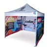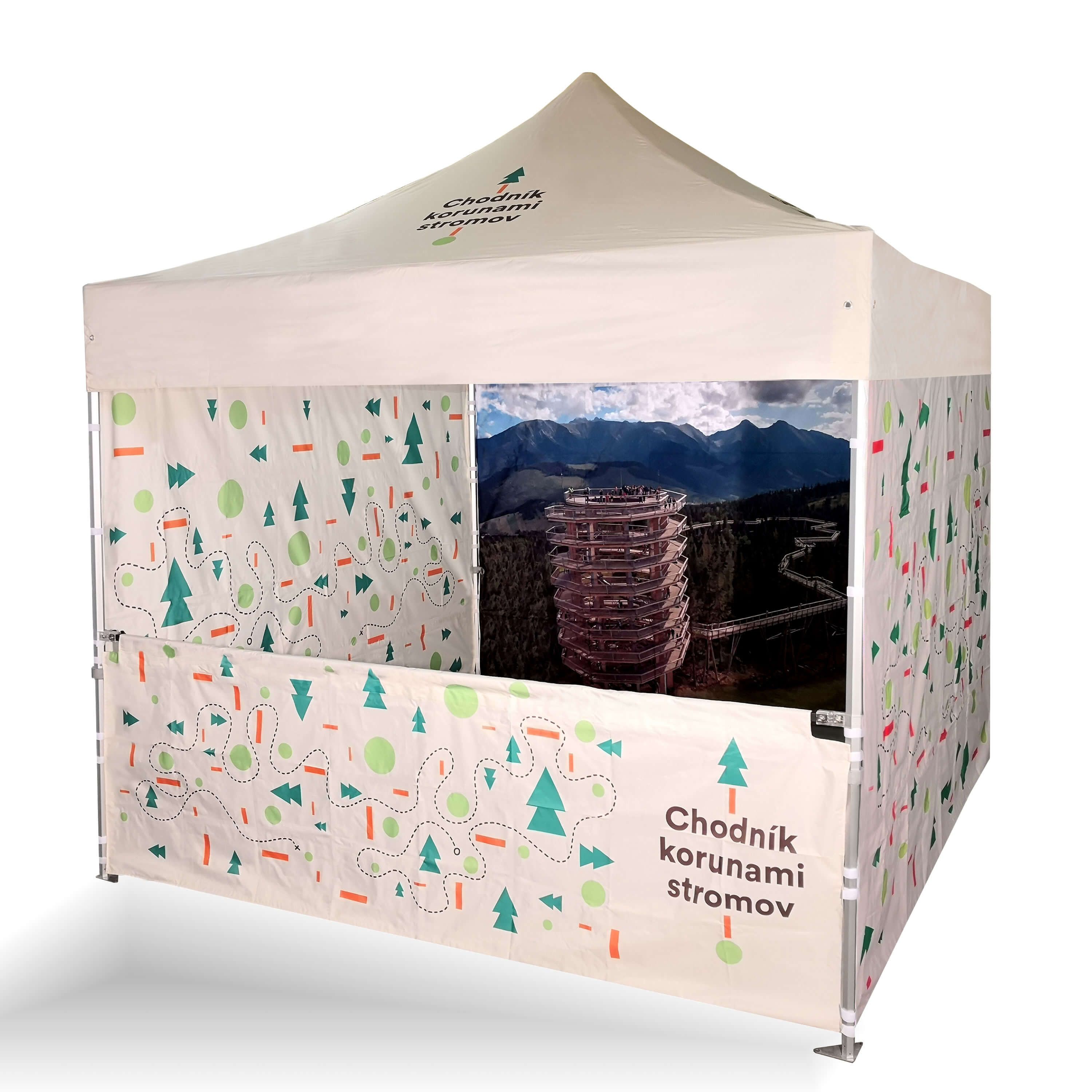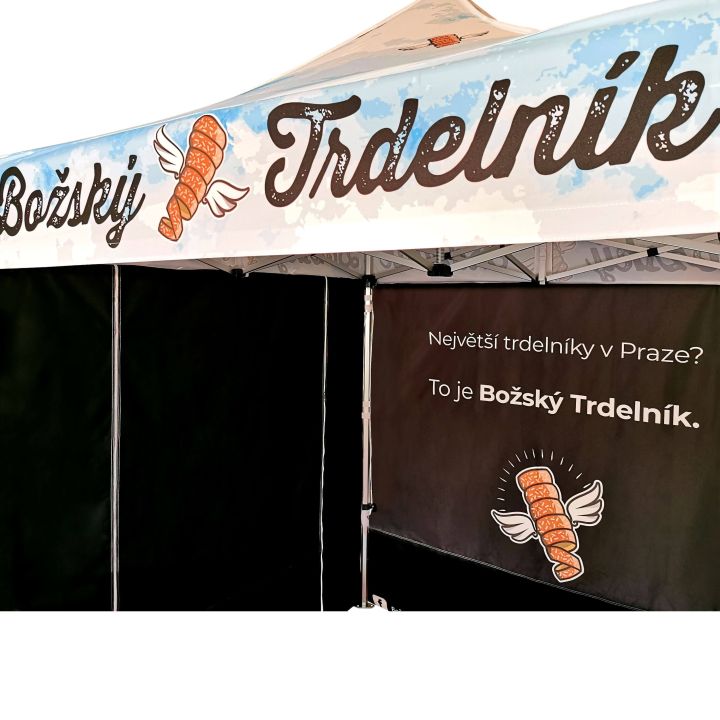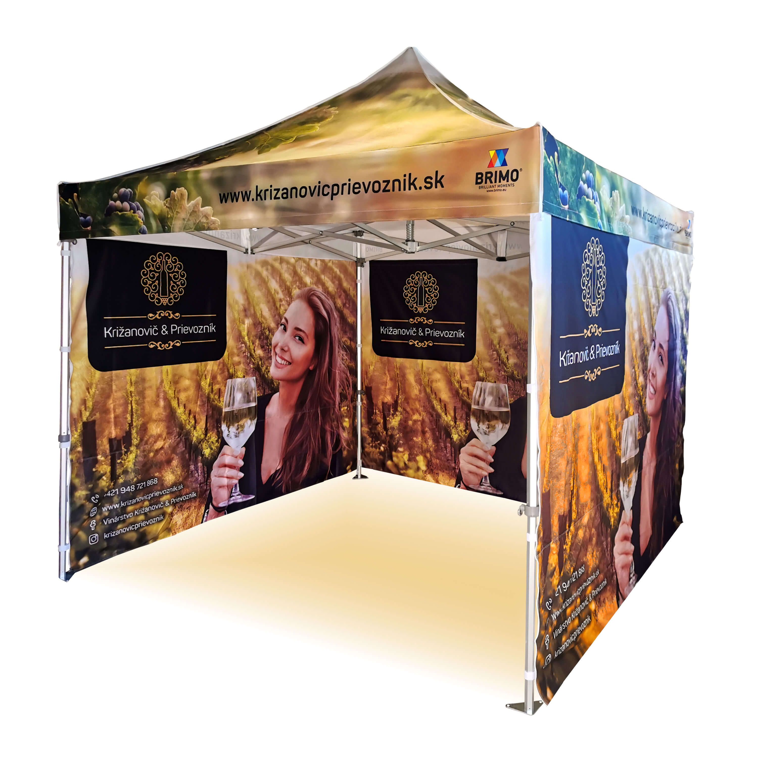 Corturi publicitare cu imprimare digitală prin sublimare. Imprimarea apare printr-un proces chimic în care cerneala, sub influența temperaturii ridicate, pătrunde direct în structura materialului. Logo, text sau orice tip de grafică pe partea interioară sau exterioară a cortului, conform dorințelor clientului.