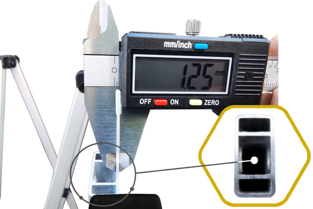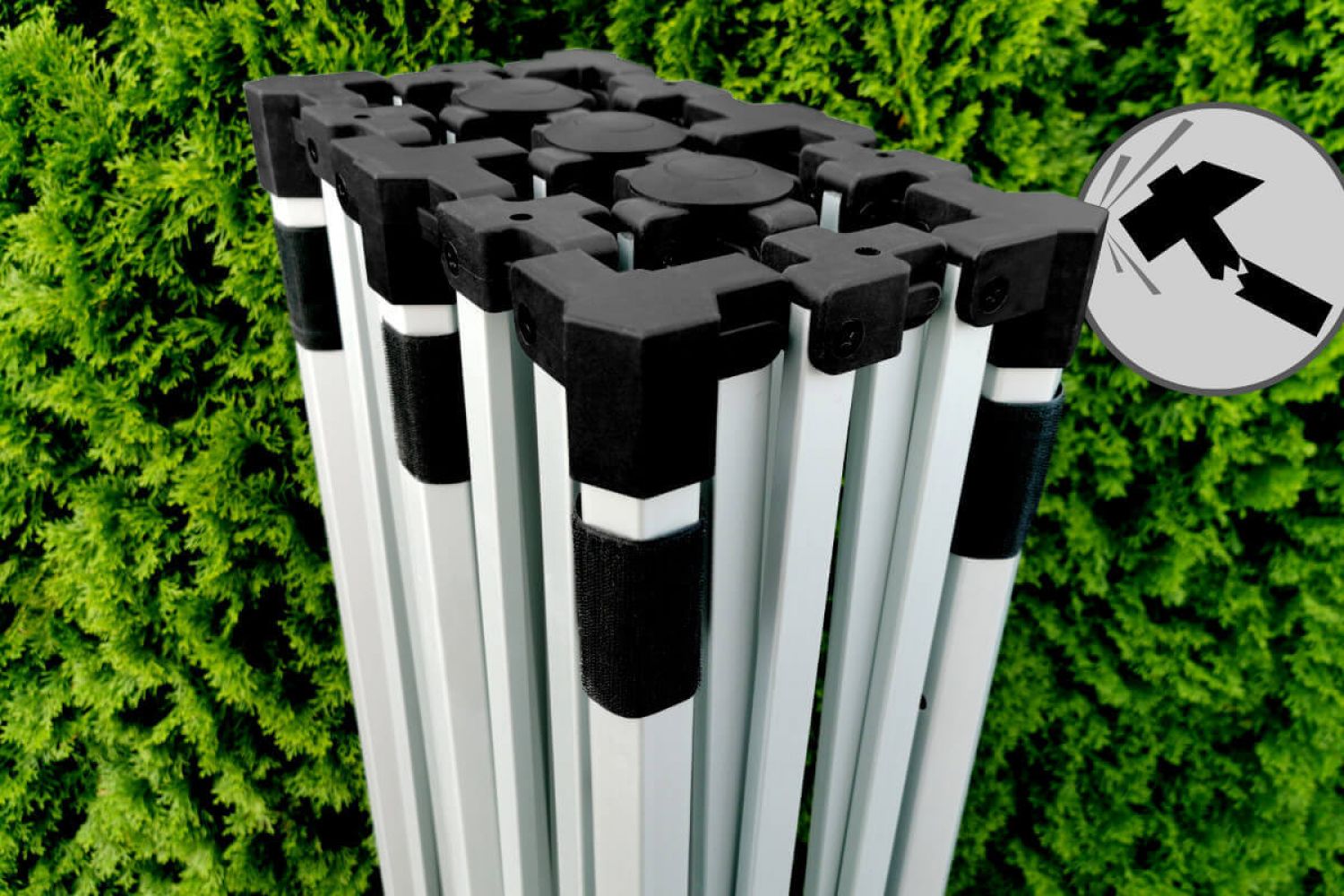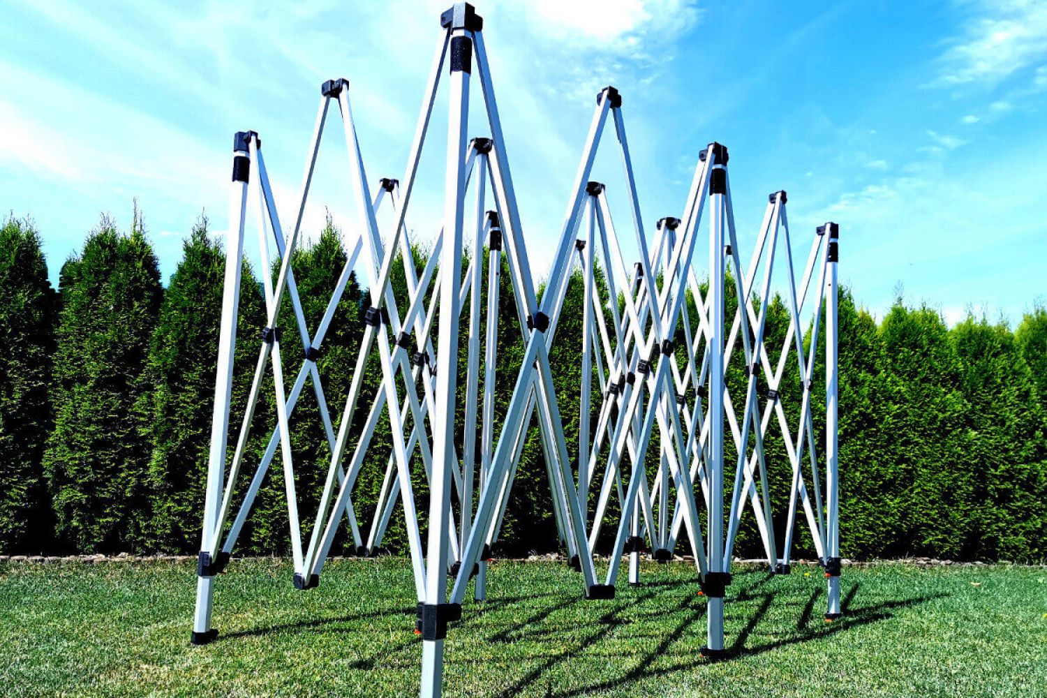 Construcția solidă este fabricată din aluminiu anodizat. Grosimea profilurilor variază între 1,2 mm și 5 mm în funcție de piesa specifică. Cortul poate acoperi 18 metri pătrați în doar 1 minut. Înălțimea tavanului poate fi reglată la două nivele diferite. Elementele de legătură care unesc piesele sunt realizate din nailon de calitate, rezistent la șocuri. Partea de jos a piciorului este echipată cu picioare groase, care servesc la ancorarea cortului. Construcția din aluminiu este estetică și rezistentă la coroziune.