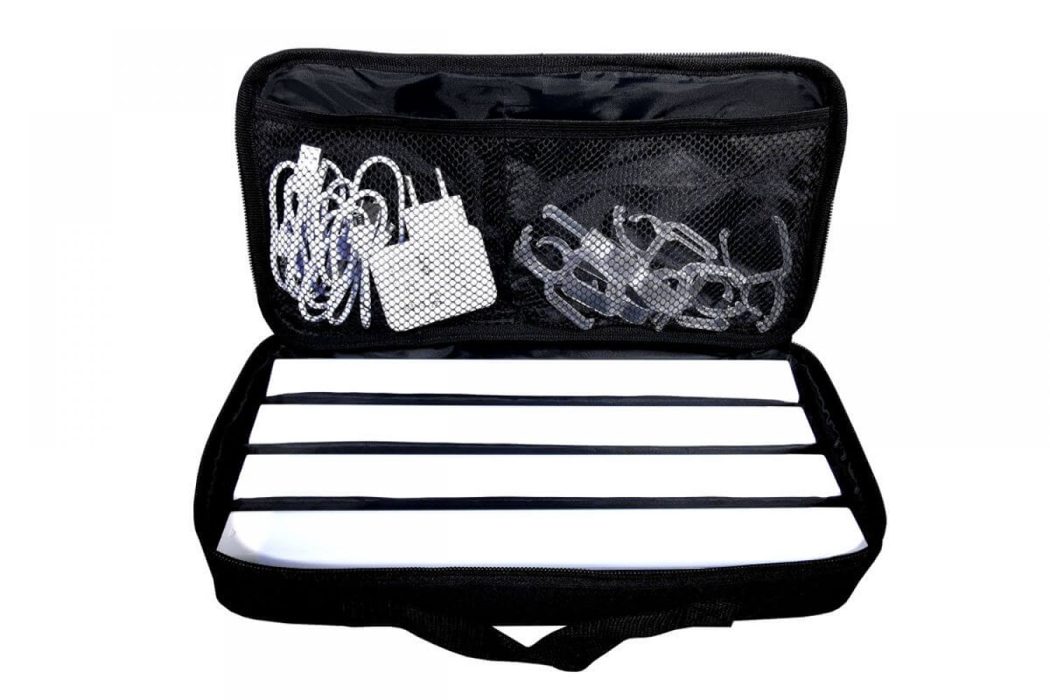 - Pachetul contine: 4x LED cu baterie incorporata, 4x cablu USB, 1x adaptor de incarcare, 8x clip pentru maner, 1x geanta.